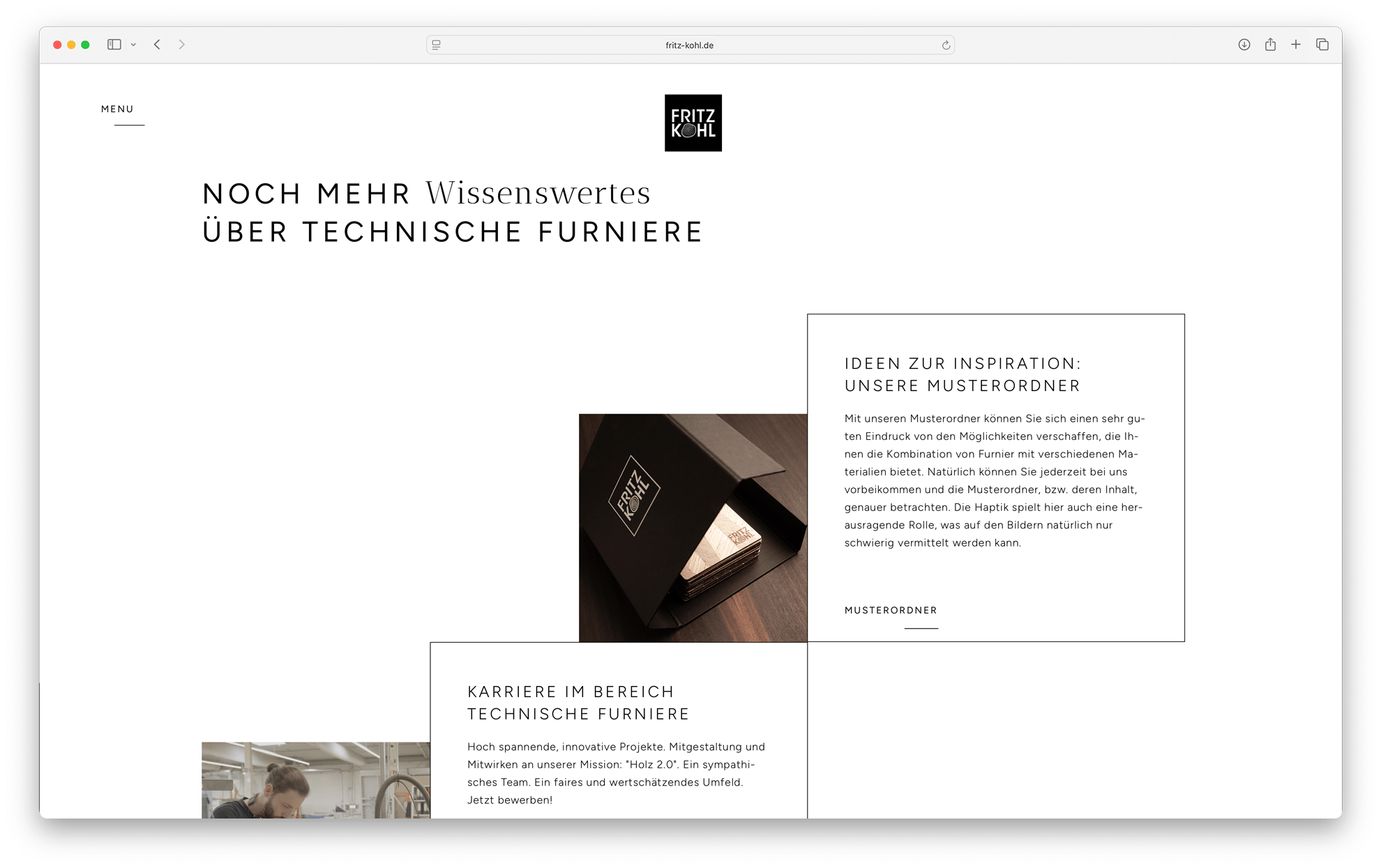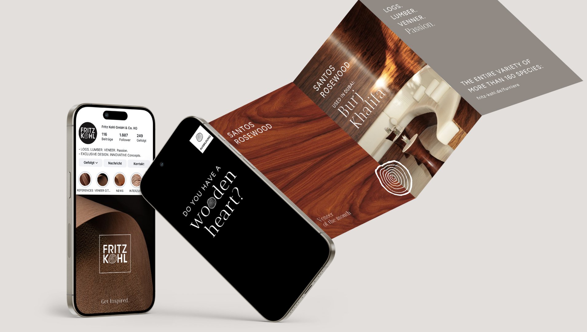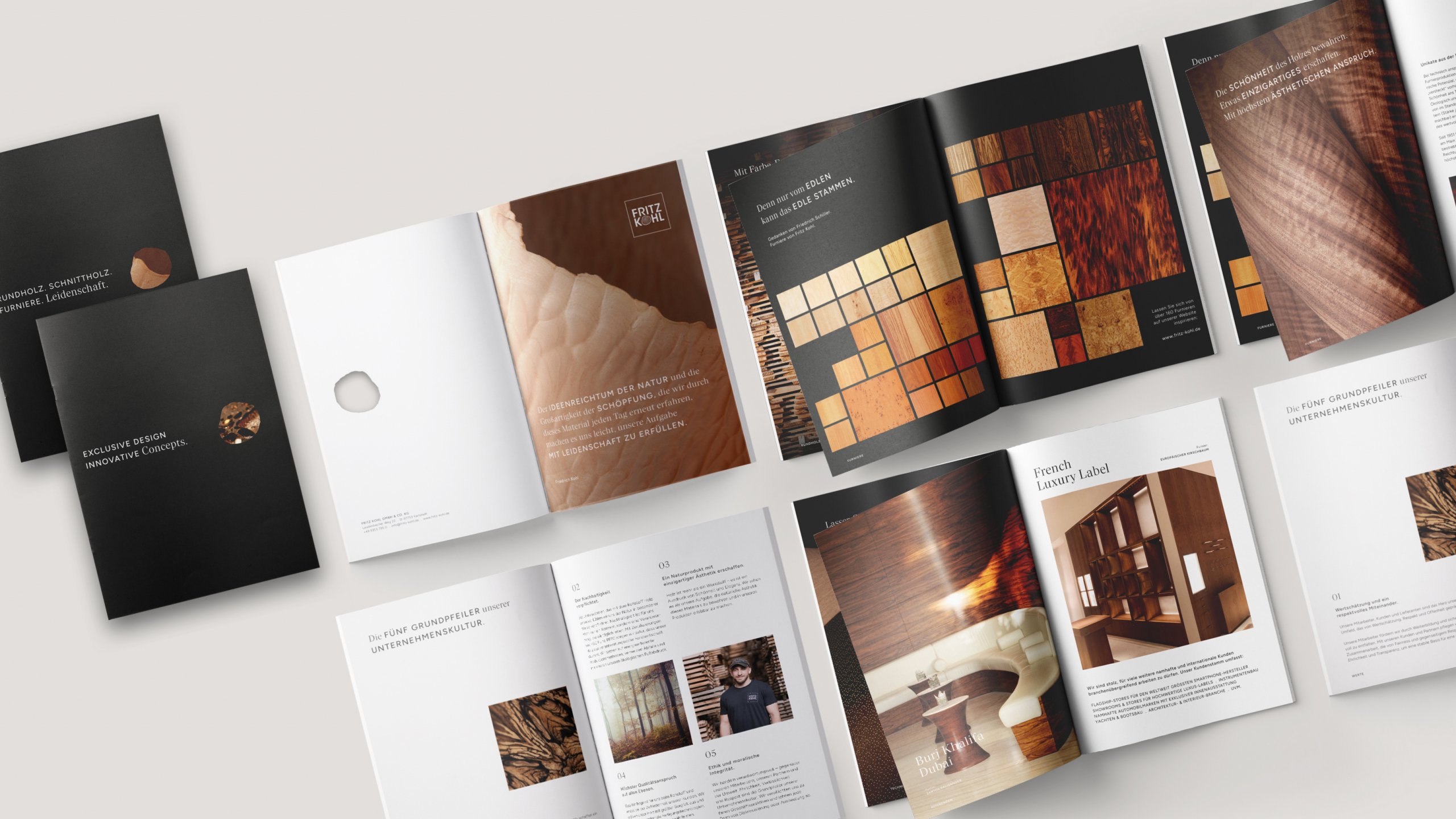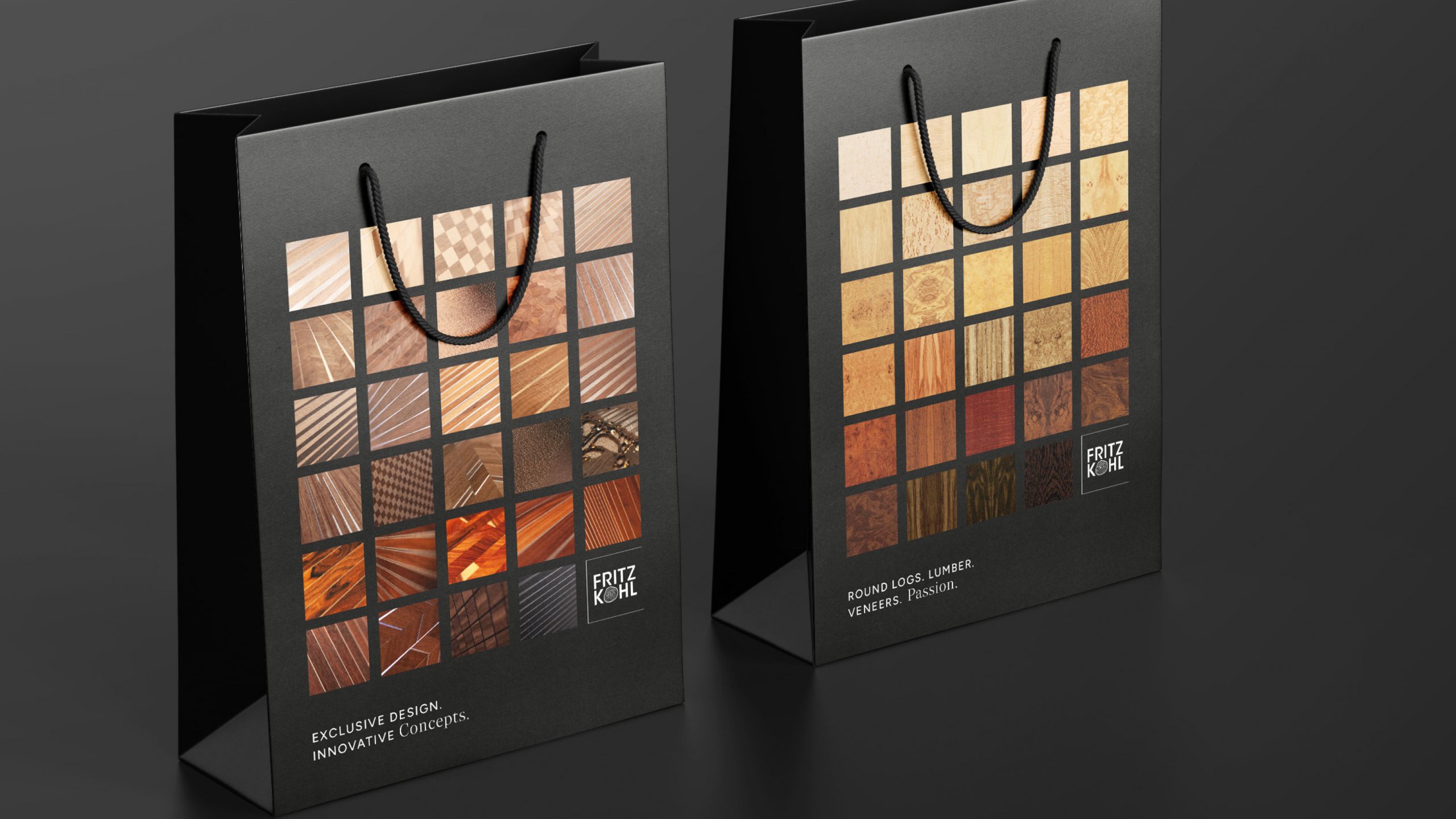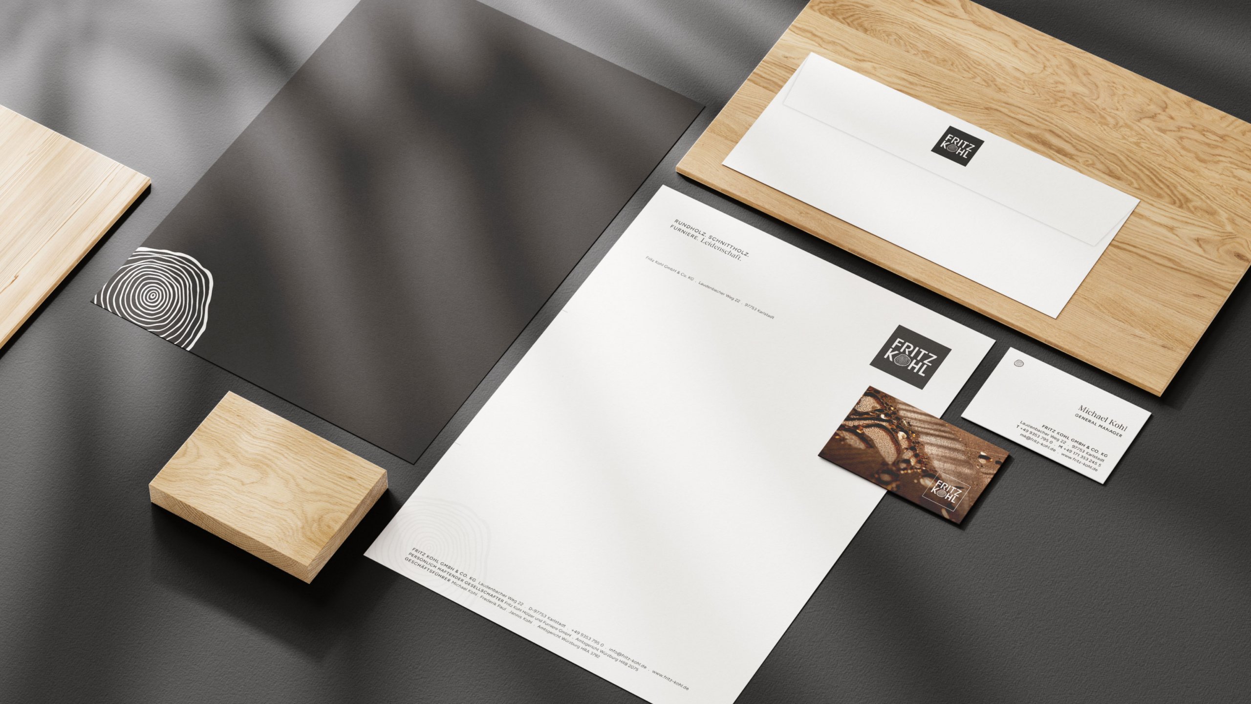 Wir wurden beauftragt, das gesamte Corporate Design neu zu gestalten und dabei die unverwechselbare Identität von Fritz Kohl zu bewahren, insbesondere das Logo mit seiner markanten Typografie und dem ikonischen Symbol, die Hauptfarbe Schwarz sowie die Furnierpräsentation in Quadraten und Streifen. Der Designprozess war daher von einer behutsamen Annäherung an eine modernere, visuell ansprechende Richtung geprägt.