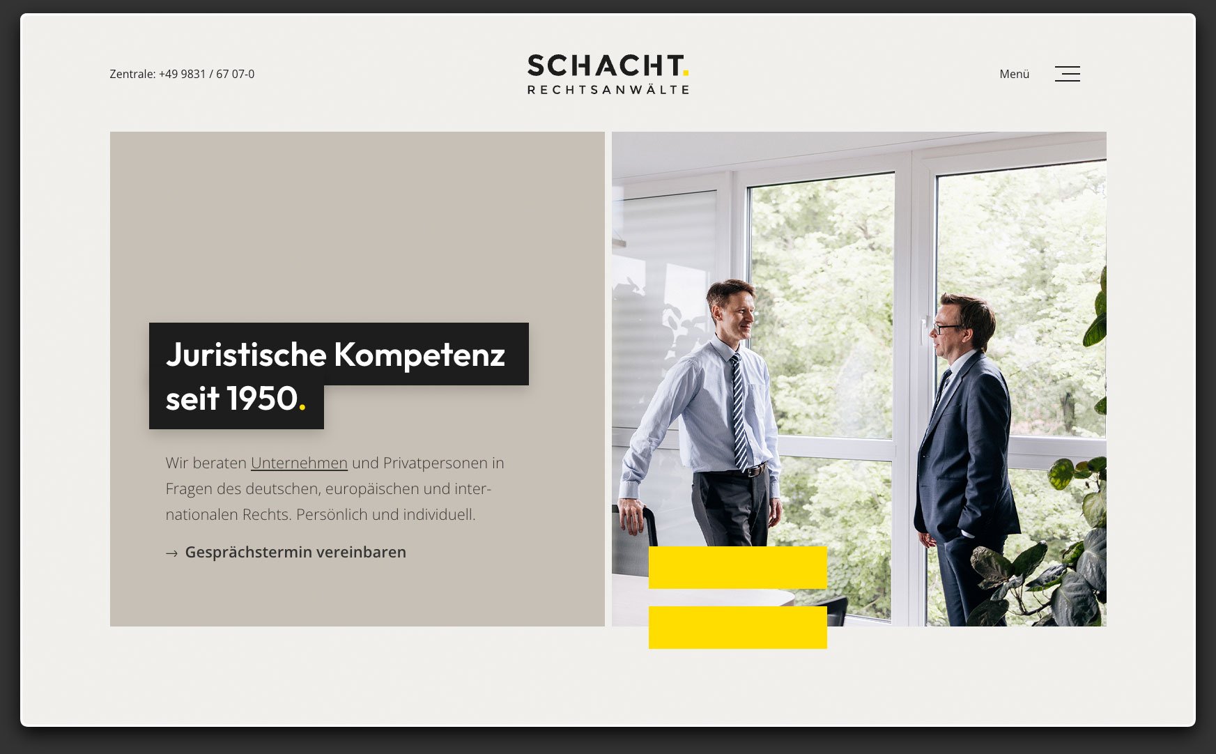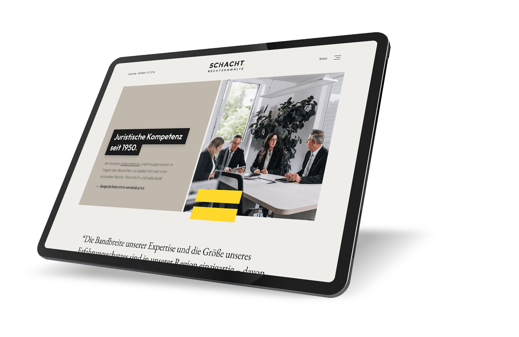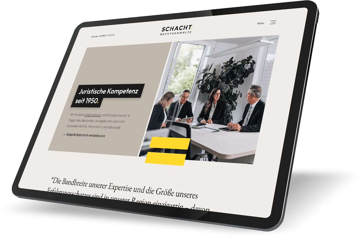 Schacht Rechtsanwälte ist eine der führenden Anwaltskanzleien Frankens. Die bisherige Internetpräsenz war aufgeteilt auf zwei separate Seiten für Privatpersonen und Unternehmen. Um den Verwaltungs- und Pflegeaufwand zu minimieren, sowie einen repräsentativen Überblick über die Leistungen der Kanzlei auf einer Seite zu gewährleisten, sollten die Inhalte beider Seiten auf einer neuen Corporate Website zusammengeführt werden.