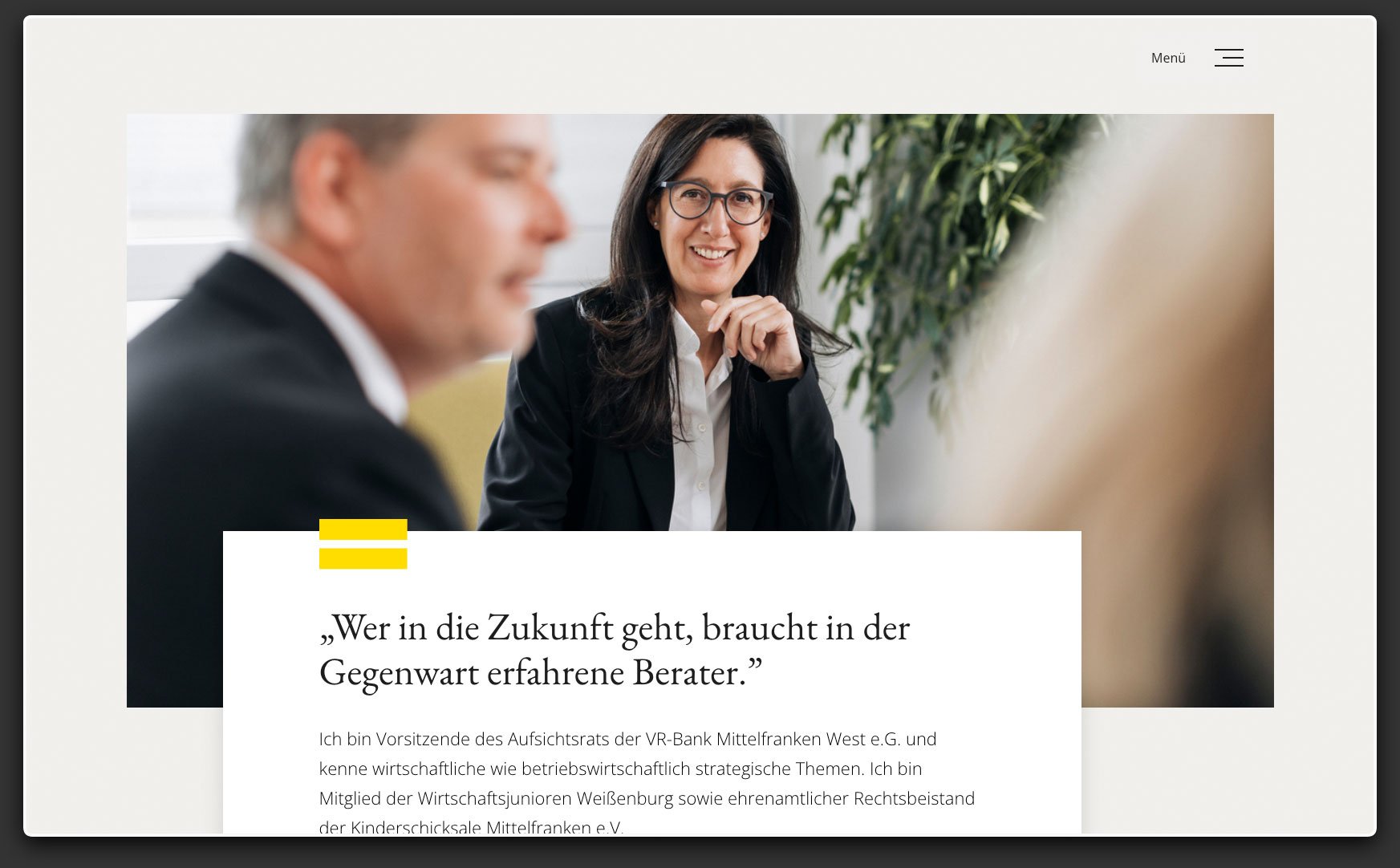 Das bestehende Corporate Design wurde behutsam weiterentwickelt. Eine sorgfältig ausgewählte Typografie setzt auf klare Botschaften und hohe Lesbarkeit, kombiniert mit Zitaten in ausdrucksstarken Serifen.